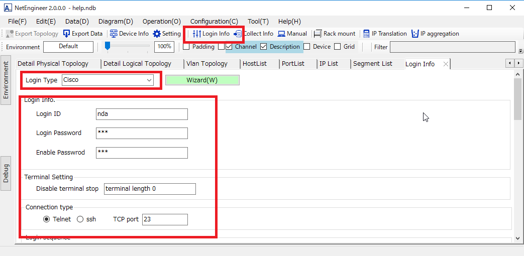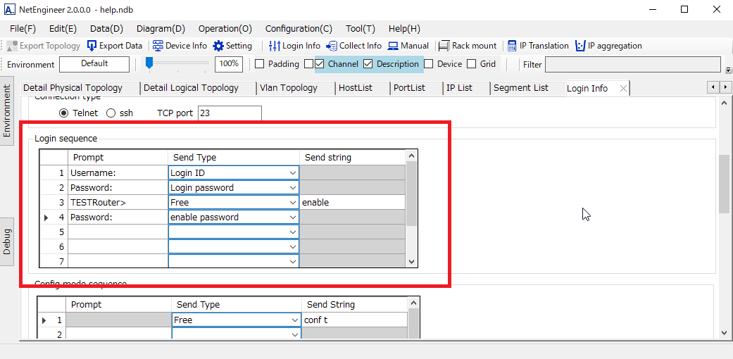 Prompt・・・Wait message(Please leave blank at first line.) Send type ・・・Choose from "Login ID" "Login Password" "enable Password" "Free". Send string・・・When "free" is selected for "Send type", set the string to be sent. Example: configure terminal