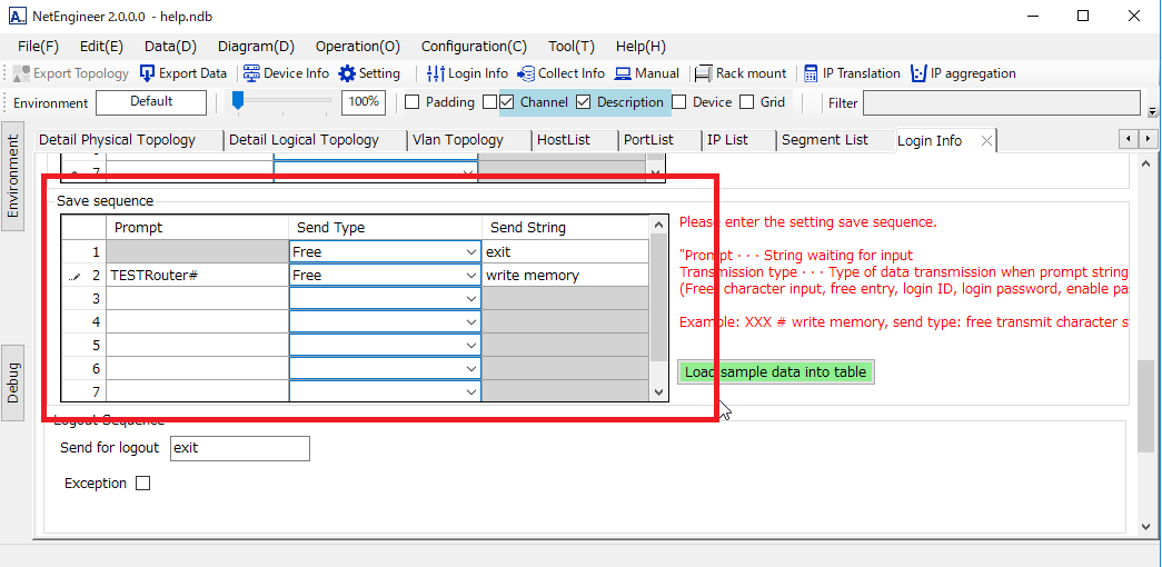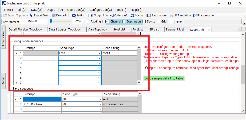 Prompt・・・Wait message(Please leave blank at first line.) Send type ・・・Choose from "Login ID" "Login Password" "enable Password" "Free". Send string・・・When "free" is selected for "Send type", set the string to be sent. Example:write memory