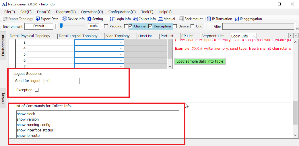 Send Logout・・・Please enter the string to be sent for logout. It will be sent repeatedly until logout is completed. Example: exit Commands for collecting information・・・Please enter the command list used in Collecting information and Operation manual.