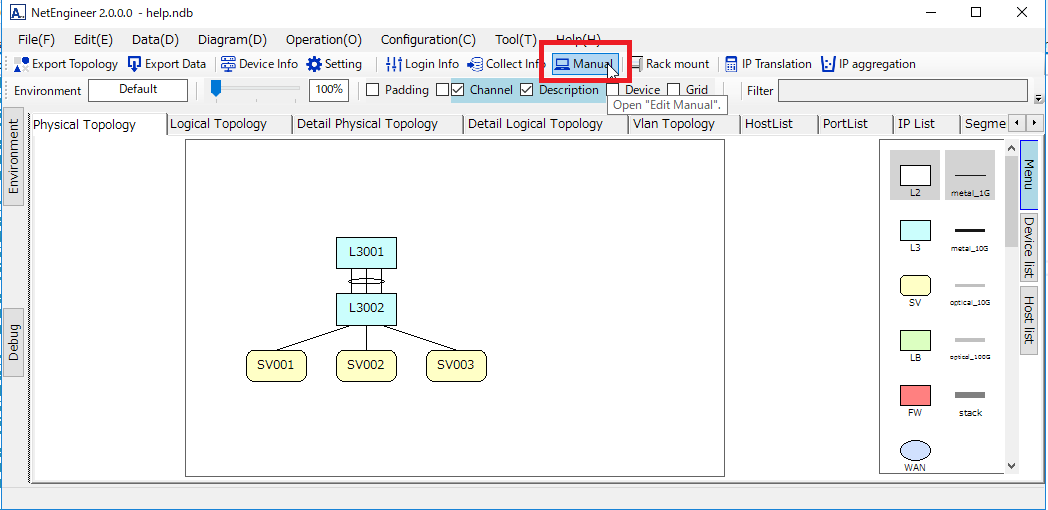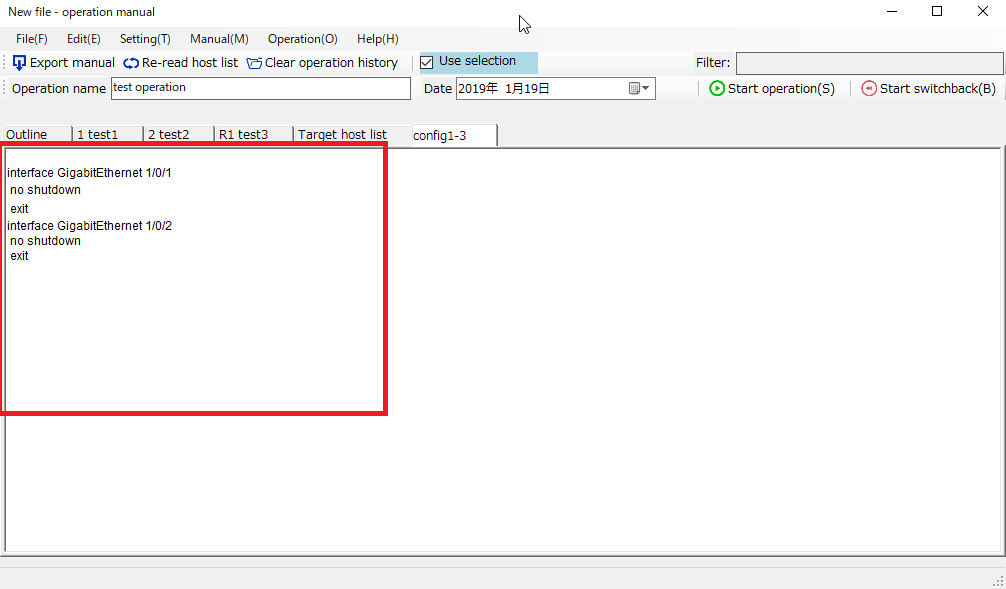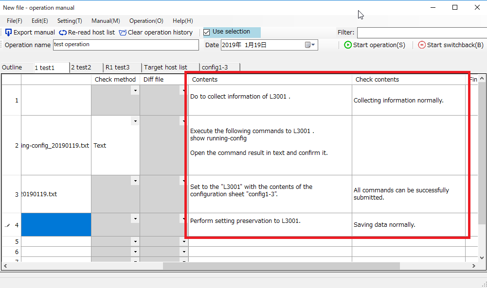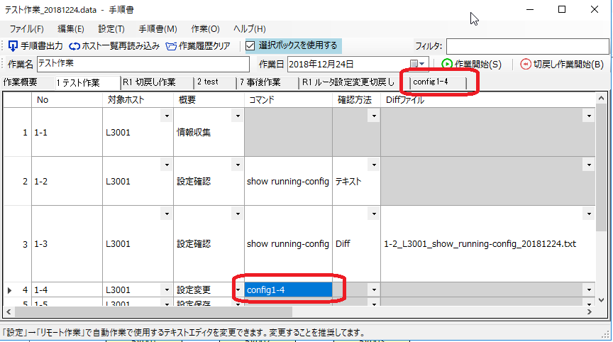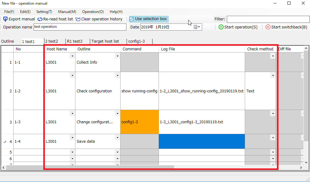 "configuration change" ... Submit the configuration file (another sheet) specified in the "Command" column. "Save data" ... Executes "save data sequence" set with "login information". "Manual operation" ... You can perform tasks manually rather than automatically. Only popup will be output.