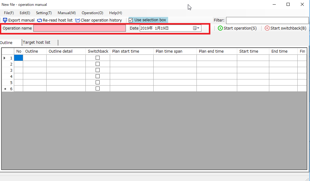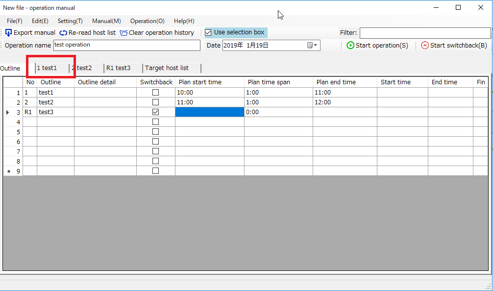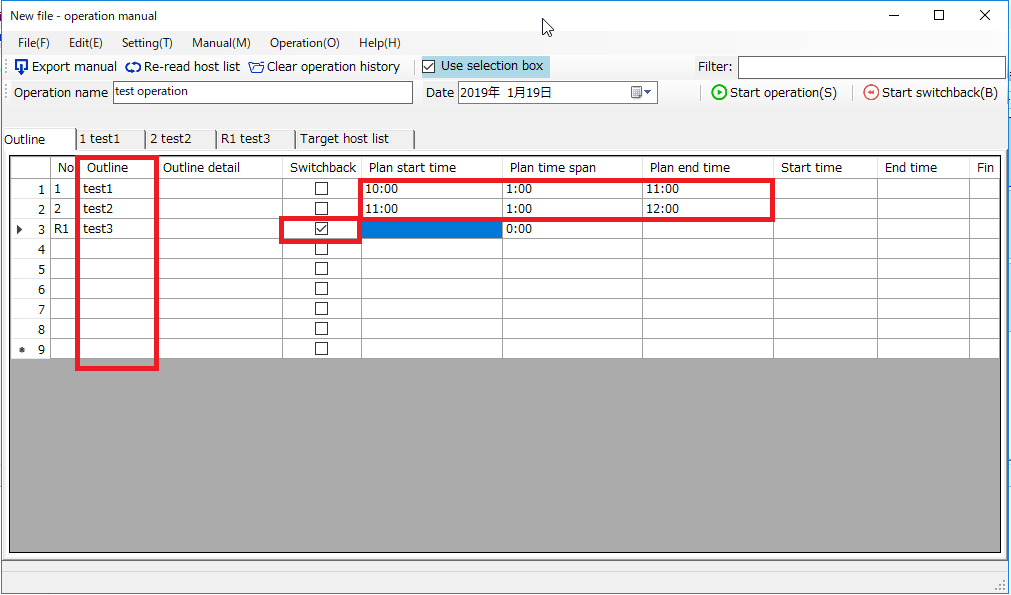 Please input "outline" and "Plan start time" and "Plan end time" in "outline" sheet. "Outline" is used for sheet name, "Plan start time" and "Plan end time" are used for time chart. If you check "Switchback", it will be recognized as a switchback operation.