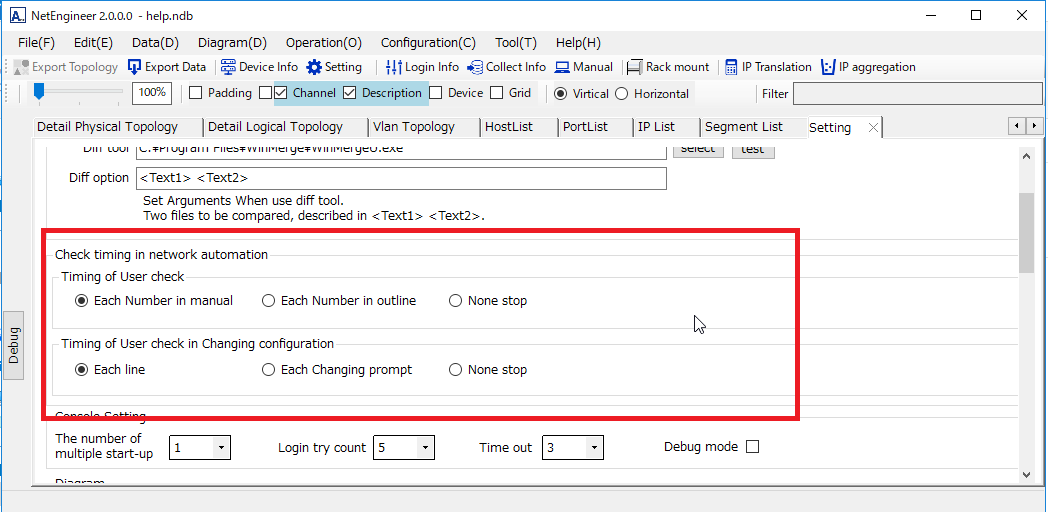 "Timing of user check in changing configuration" 「Each line」 ・・・Confirm that setting change is sent line by line. 「Each changing prompt」・・・If you receive different prompts and messages before and after, it confirms the user. 「None stop」 ・・・During setting change, user confirmation is not performed.