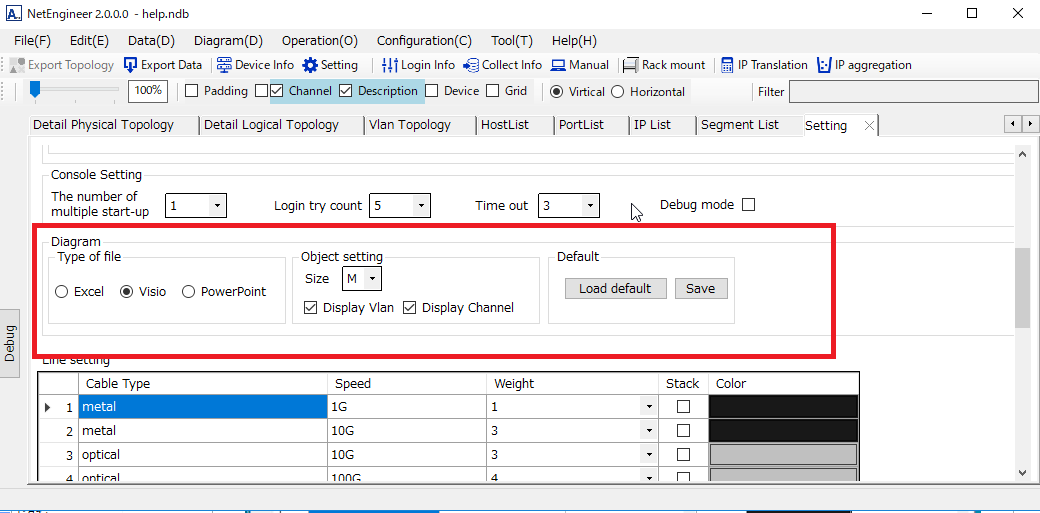 「File type」 ・・・You can select Excel、Visio、PowerPpoint as file type. It must be installed. 「Object」 ・・・You can set whether to display the object size, Vlan and channel. 「Load default」・・・Load default values into line settings and object settings.